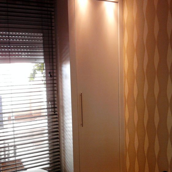 Conjunto de dos armarios iguales para distintas zonas, uno estrecho a medida y otro en rinconera. Ambos armarios han sido adaptados para incluir iluminación de bajo consumo LED y mantienen el mismo estilo en diferentes espacios.